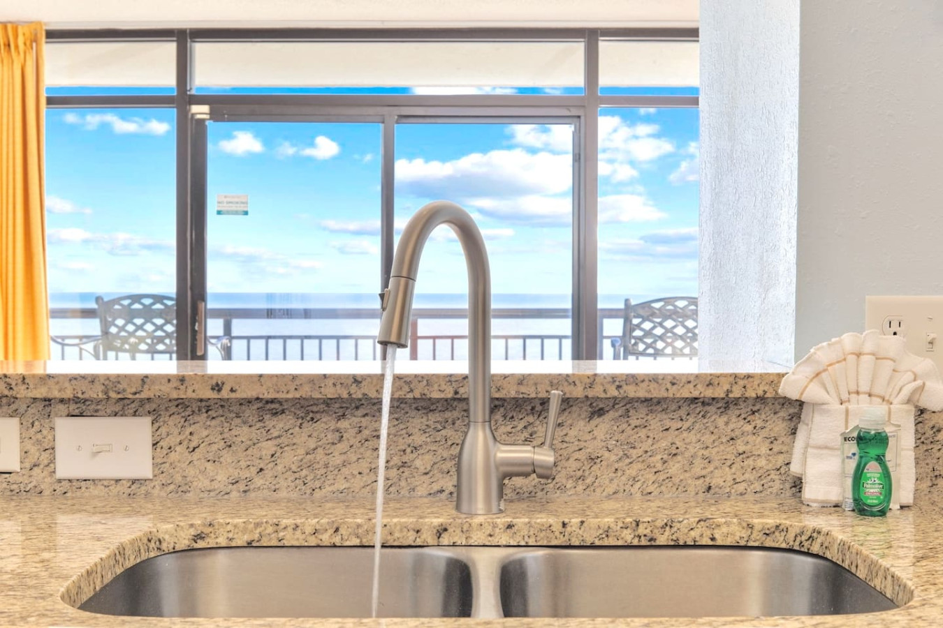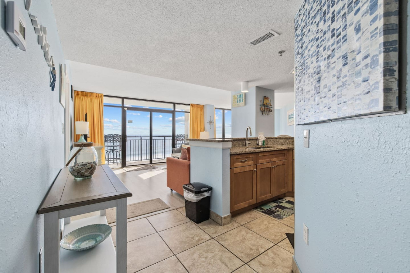 Step into a spacious, open-concept layout featuring a comfortable living area with seating for six and a 50” Smart TV. For those cozy nights in, the kitchen offers everything needed for a homemade meal, including brand new modern appliances, granite countertops, a full stove/oven, microwave range, coffee maker drip and k-pod, toaster, blender, and all essential cookware. Gather around the 6-person formal dining table for a meal with ocean views as the perfect backdrop and seat 2 at the kitchen bar.
