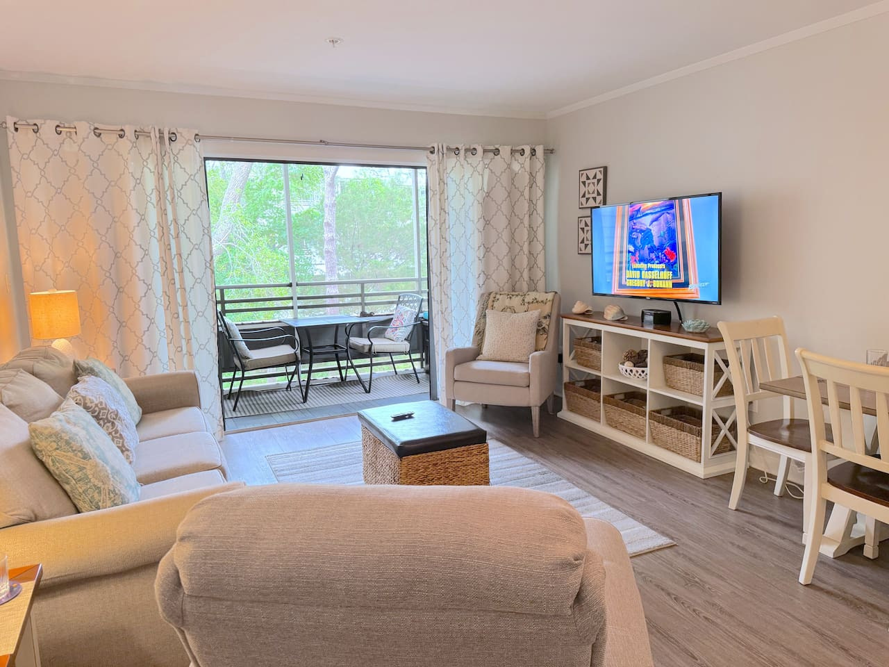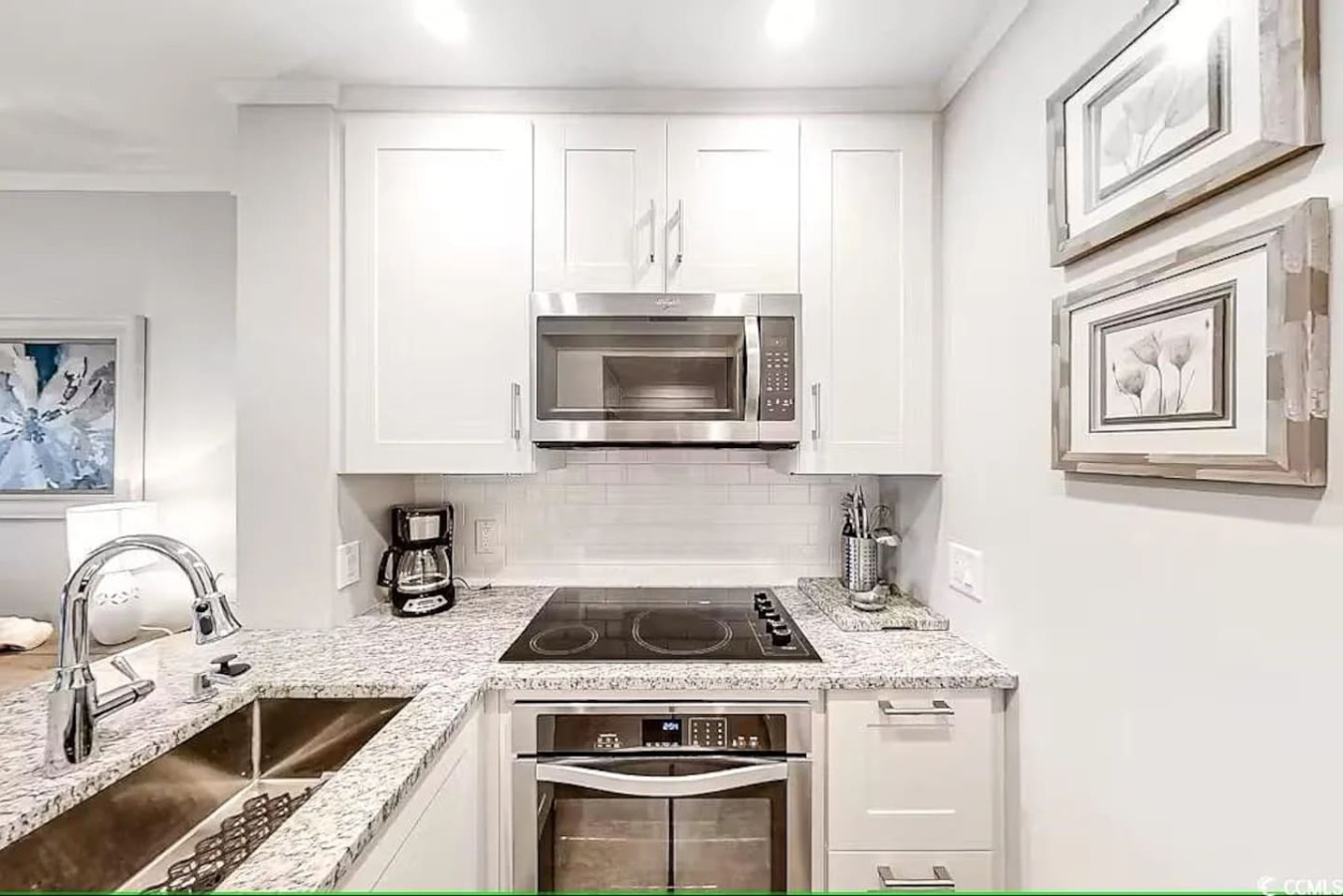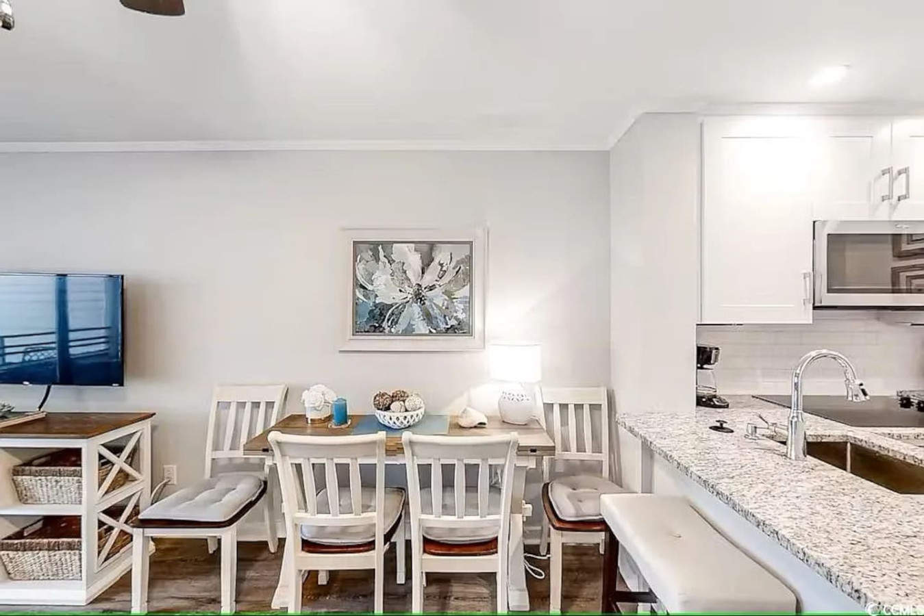 Discover this beautifully updated one-bedroom condo in Lodge 1 East at Ocean Creek Resort in Myrtle Beach. This highly sought-after location places you just steps from the beach, the peaceful courtyard, the Four Seasons restaurant, and the oceanfront Beach Club Lounge. Inside, you’ll find a spacious and bright interior featuring a king-size bedroom, a fully updated kitchen with granite countertops, stainless steel appliances, and white shaker cabinets, and an open-concept living and dining area perfect for relaxing or entertaining. The modern bathroom showcases custom shiplap walls and stylish fixtures, while luxury vinyl plank flooring runs throughout the unit, adding a sleek, cohesive look. Step out onto your screened-in balcony to enjoy tranquil wooded views and ocean breezes. Ocean Creek Resort is a 57-acre gated community offering a wide range of amenities, including indoor and outdoor pools, tennis courts, a fitness center, and an oceanfront beach club. Plus, you’re only minutes from Barefoot Landing, shopping, dining, and entertainment!
