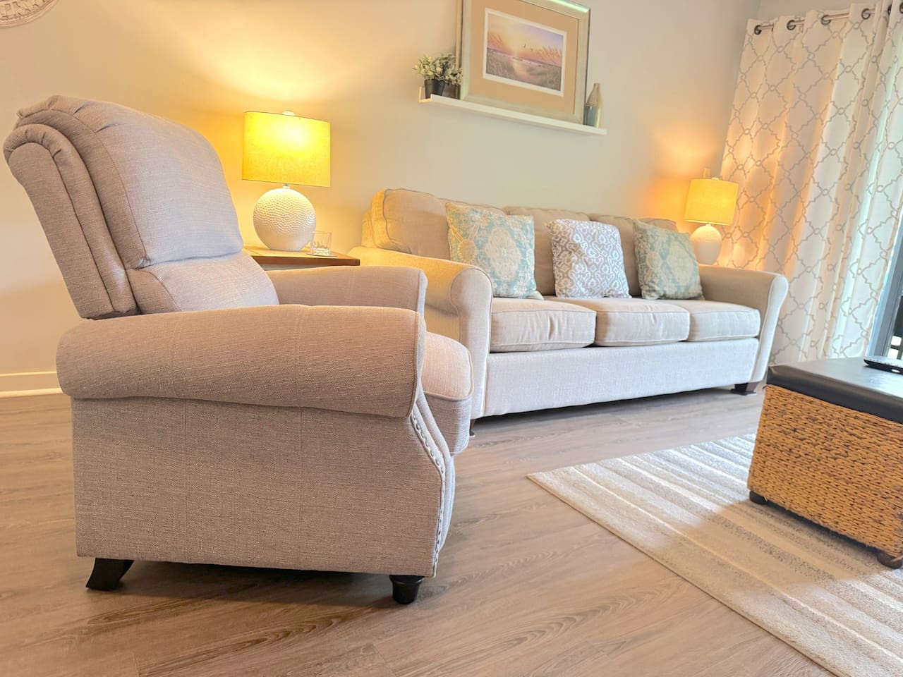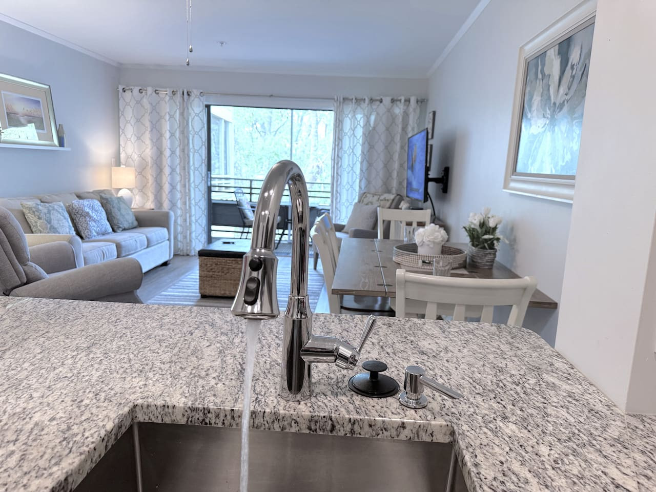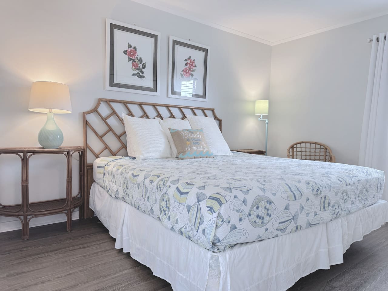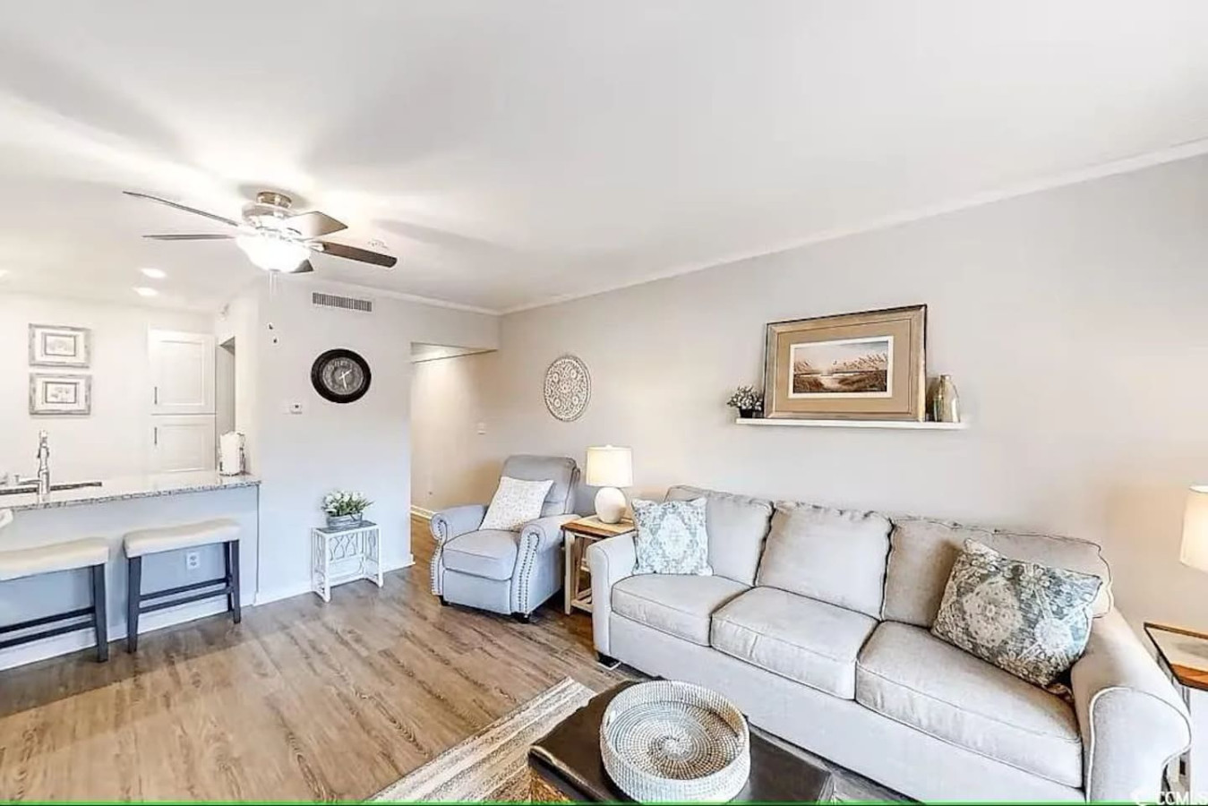 Discover this beautifully updated one-bedroom condo in Lodge 1 East at Ocean Creek Resort in Myrtle Beach. This highly sought-after location places you just steps from the beach, the peaceful courtyard, the Four Seasons restaurant, and the oceanfront Beach Club Lounge. Inside, you’ll find a spacious and bright interior featuring a king-size bedroom, a fully updated kitchen with granite countertops, stainless steel appliances, and white shaker cabinets, and an open-concept living and dining area perfect for relaxing or entertaining. The modern bathroom showcases custom shiplap walls and stylish fixtures, while luxury vinyl plank flooring runs throughout the unit, adding a sleek, cohesive look. Step out onto your screened-in balcony to enjoy tranquil wooded views and ocean breezes. Ocean Creek Resort is a 57-acre gated community offering a wide range of amenities, including indoor and outdoor pools, tennis courts, a fitness center, and an oceanfront beach club. Plus, you’re only minutes from Barefoot Landing, shopping, dining, and entertainment!